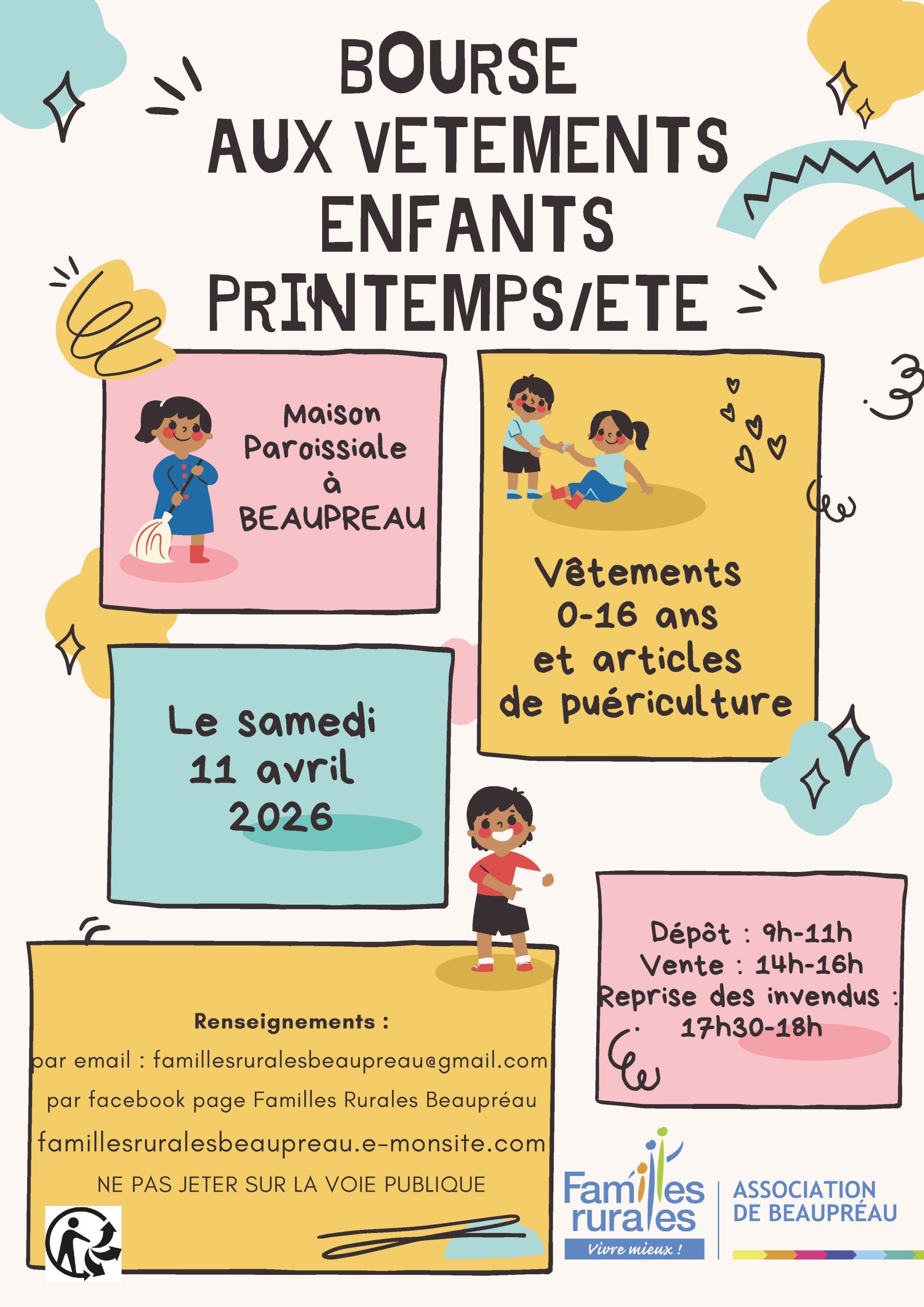 L’association Familles Rurales de Beaupréau organise une bourse aux vêtements enfants (printemps/été ). Des vêtements du 0 à 16 ans et des articles de puériculture seront vendus.