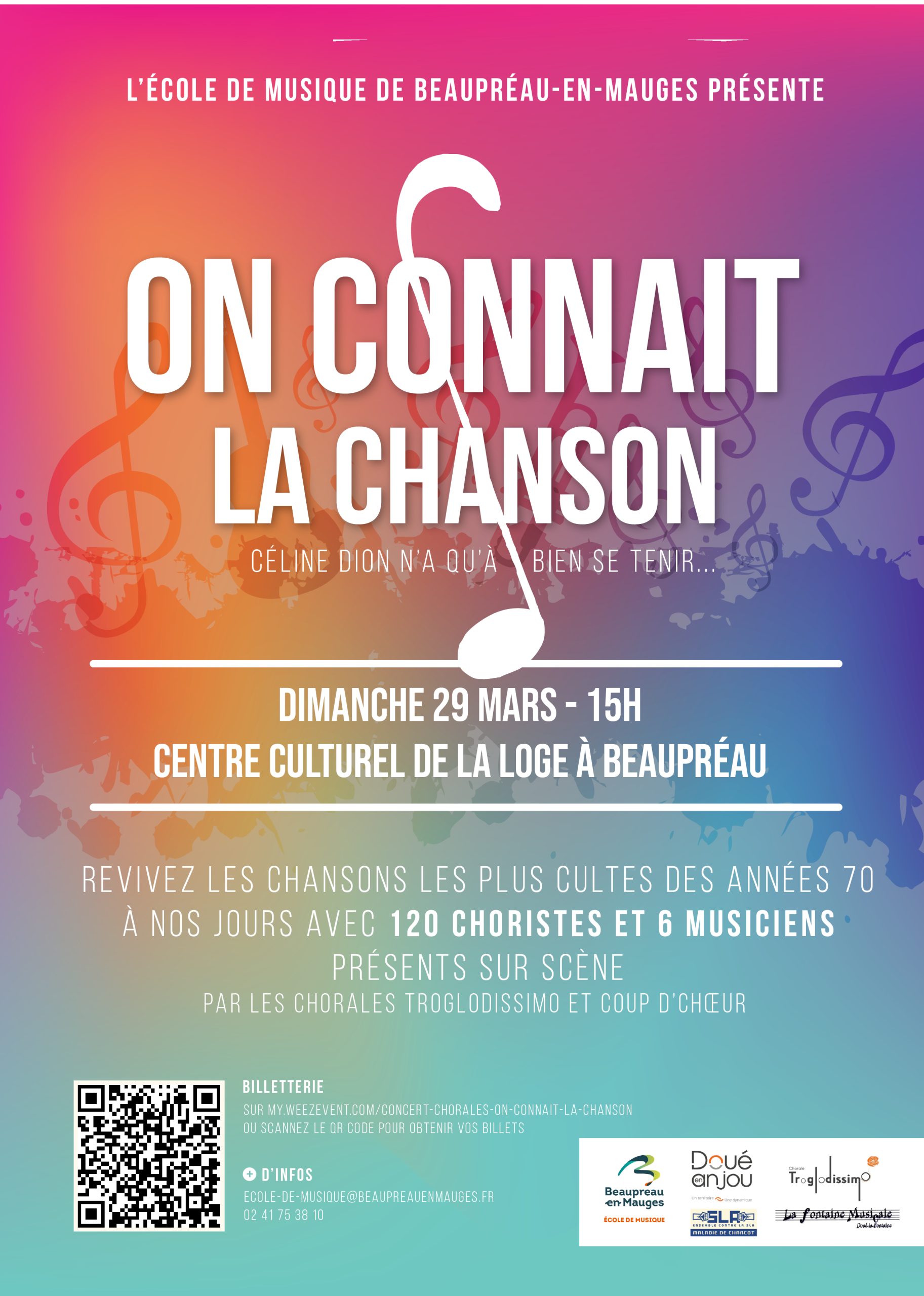 La chorale Coup d’choeur de l’école de musique de Beaupréau-en-Mauges partage la scène avec la chorale Troglodissimo de Doué-en-Anjou lors d’un concert où 120 choristes et 6 musiciens seront présents sur scène pour vous faire danser et chanter !