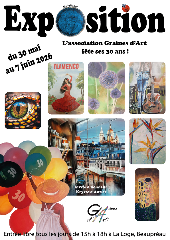 L’association Graines d’Art qui fête cette année ses 30 ans vous propose de venir déambuler à l’exposition de ses 39 adhérents de Beaupréau-en-Mauges et des Mauges. Une balade artistique haute en couleurs et en éclectisme à la Loge.