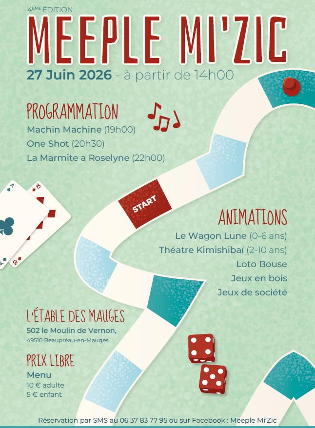 Enfant 5€ – Adulte 10€ – Pensez à réserver : 06 37 83 77 95 ou sur facebook Meeple Mi’zic