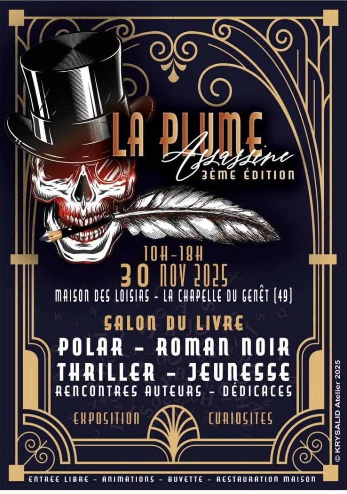 Salon de littérature noire, polar, roman noir, thriller. Salon jeunesse tous publics. 28 auteurs venus de toute la France et même du Japon. Rencontre auteurs et dédicace. Restauration et buvette (maison)
