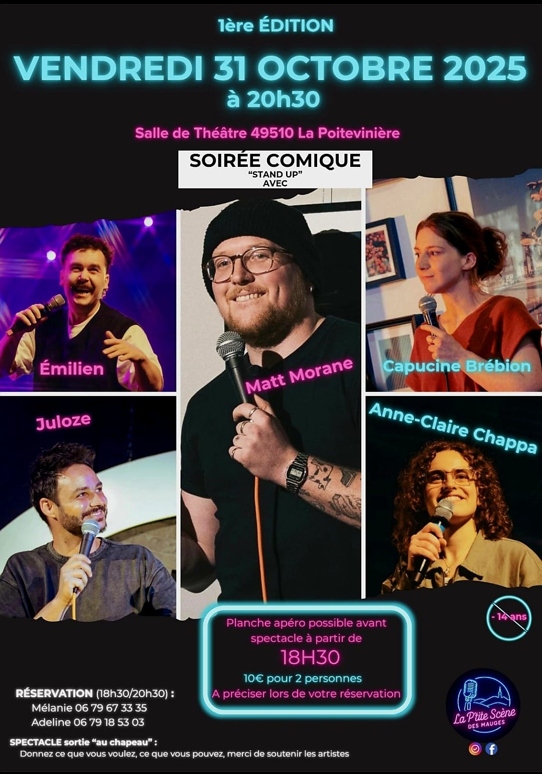 Un groupe d’habitants souhaite faire vivre la salle de théâtre de La Poitevinière en accueillant de jeunes talents (musique, théâtre, humour…). Pour cette 1ère édition, ce sont 5 artistes qui monteront sur scène !