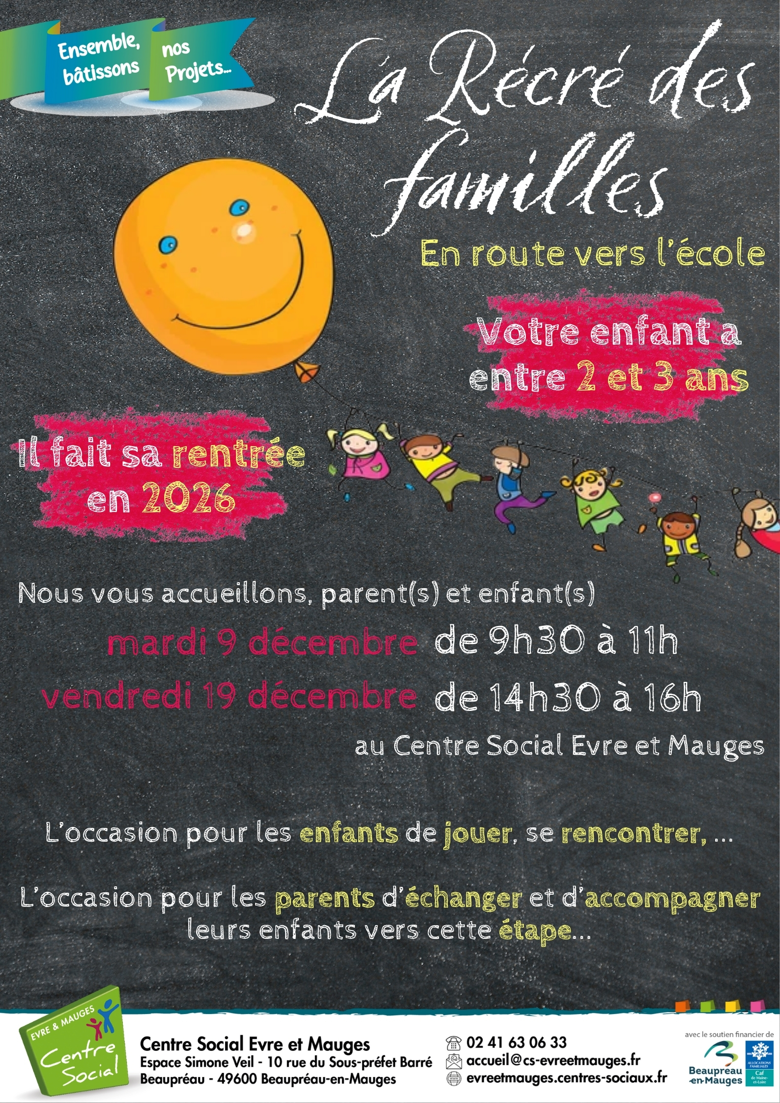 Le Centre Social vous propose de participer à des temps ouverts aux familles et aux enfants de 2 à 3 ans qui vont faire leur rentrée à l’école.