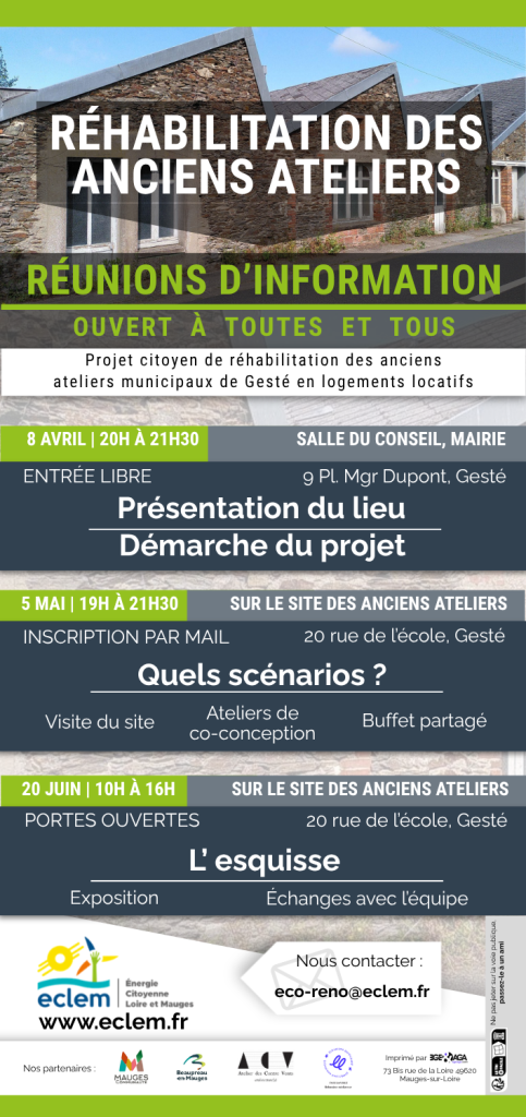 • mardi 5 mai de 19h à 21h30, sur site, 20 rue de l’école : visite du site, ateliers de co-construction et buffet partagé. Sur inscription : eco-reno@eclem.fr
