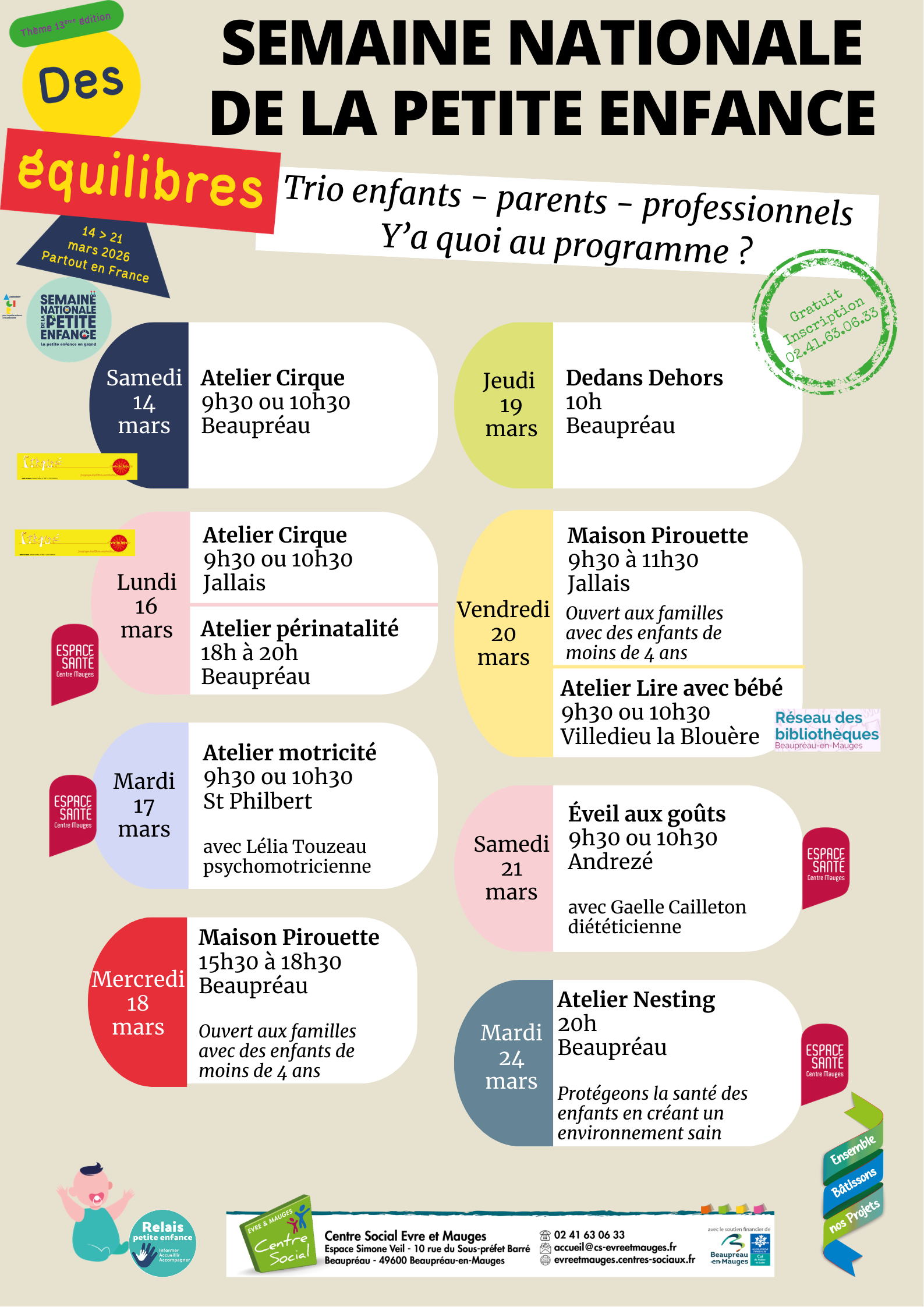 Le Relais Petite Enfance du Centre Social Evre et Mauges, s’inscrit depuis plusieurs années à ce temps fort en proposant des installations éphémères, des ateliers, soirée avec des intervenants,… Le thème de cette année est « des équilibres » du 14 au 24 mars 2026.